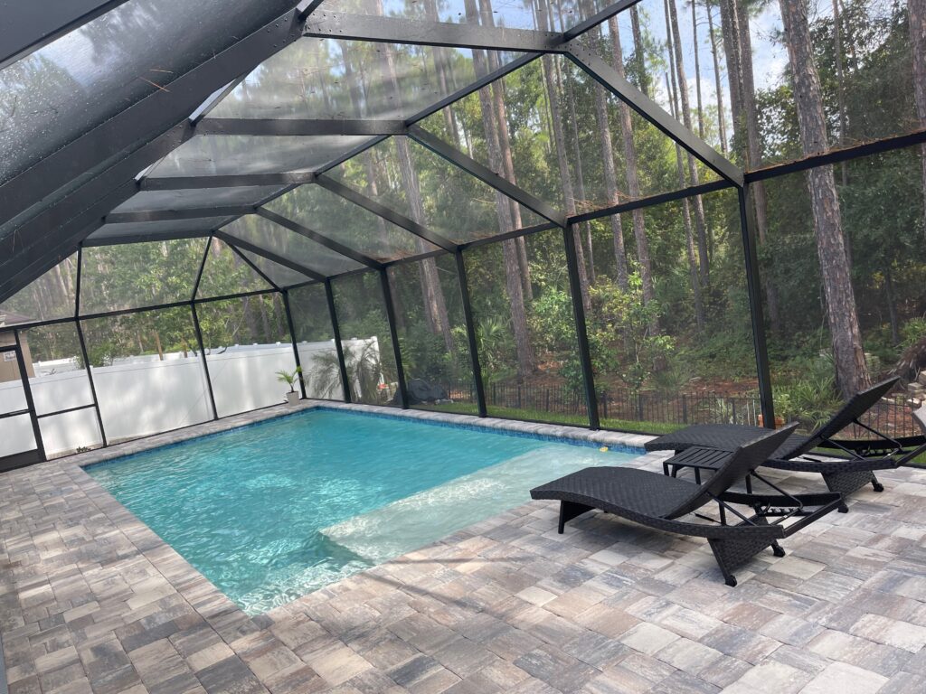 Pool with clear water, surrounded by potted plants and lounge chairs, featuring a screened enclosure, showcasing Breakwater Construction's outdoor project design.